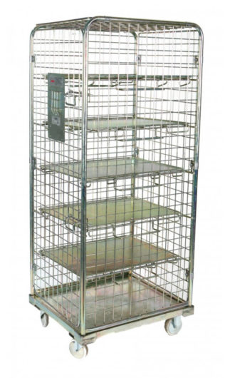 Roll grillagé équipé de 5 étagères rabattables fréquemment utilisé dans l’industrie agro-alimentaire.